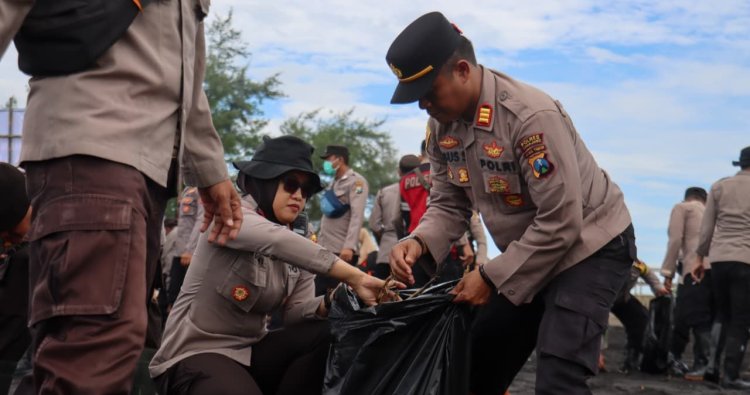 Ratusan personel Polres Lumajang Polda Jatim menyisir bibir pantai membersihkan sampah plastik maupun limbah organik yang terbawa arus laut.